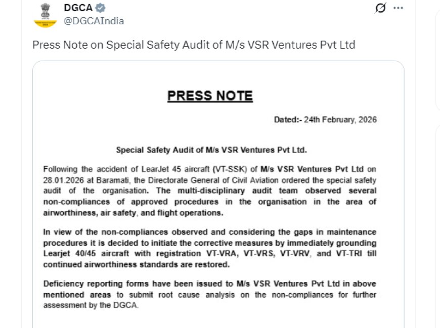 New Delhi, 25th Feb, 2026: The Directorate General of Civil Aviation (DGCA) has grounded four aircraft of VSR Ventures Pvt Ltd after finding safety lapses during a special audit.